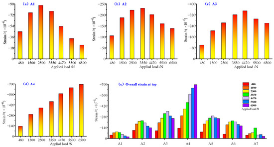 The strain gauges at the top of the pipeline were arranged from left to right, and a uniform load was applied to the middle of the pipeline. The strain (ε/−10−6) evolution from A1 to A7 is shown in Figure 4. The positive strain represents tension, and the negative strain represents compression. Under the action of its own gravity and the applied load, the internal bending moment caused bending deformation and produced additional bending axial stress. The strain in A1 increased gradually with the increase in the load in the range of 480~2500 N, decreased gradually with the increase in the load in the range of 2500~6500 N, and reached the maximum at 2500 N (Figure 5a). The strain in A2 increased gradually with the increase in the load in the range of 480~3550 N, decreased gradually with the increase in the load in the range of 3550~6500 N, and reached the maximum when the applied load reached 3550 N (Figure 5b). A1 and A2 were initially without load, so it was considered that the strain distribution at the top of the pipeline at the edge of the load increased first and then decreased. The strain at the A3 position at the end of the uniform bearing section of the pipeline gradually increased with an increase of the load in the range of 480~4470 N, and gradually decreased with the increase in the load in the range of 4470~6500 N and reached the maximum at the applied load of 4470 N (Figure 5c); the strain in A4 located in the center of the uniform bearing section increased gradually with the increase in the load in the range of 480~6500 N (Figure 5d). As the load increased, the position of the maximum strain gradually shifted to the center of the pipeline from position A1 to the center position A4.