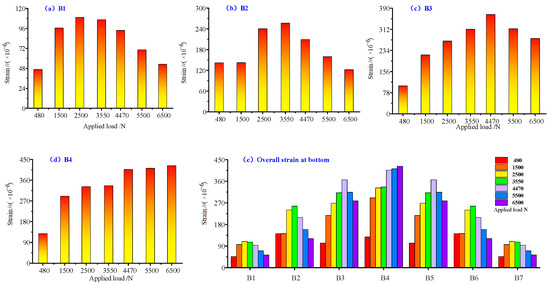 The bottom strain gauge was arranged from the left to the right of the pipeline, and the applied load was located in the center of the pipeline. Therefore, when determining the strain at the bottom of the pipeline and performing data analysis and processing, only the strain generated at the B1–B4 positions could be analyzed. The strain distribution and overall evolution at the B1–B4 positions are shown in Figure 5. Under the double influence of its own gravity and the applied load, the internal bending moment caused the bending deformation of the pipeline and produced additional bending axial stress. The strain at the B1 position of the pipeline increased gradually with the increase in the load in the range of 480~2500 N, decreased gradually with the increase in the load in the range of 2500~6500 N, and reached the maximum at the applied load of 2500 N (Figure 6a); the strain at the B2 position of the pipeline increased gradually with the increase in the load in the range of 480~3550 N, decreased gradually with the increase in the load in the range of 3550~6500 N, and reached the maximum at the applied load of 3550 N (Figure 6b); however, the B1 and B2 positions of the pipeline were in the stage of unapplied load. Therefore, it was considered that the strain distribution at the bottom of the pipeline at the edge of the applied load increased first and then decreased. The strain at the B3 position at the end of the uniform bearing section of the pipeline gradually increased with the increase in the load in the range of 480~4470 N, gradually decreased with the increase in the load in the range of 4470~6500 N, and reached the maximum at the applied load of 4470 N (Figure 6c); the strain at B4 located in the center of the uniform bearing section increased gradually with the increase in the load in the range of 480~6500 N (Figure 6d). It was found that with the increase in the load, the maximum strain position gradually shifted to the center of the pipeline from the end position B1 to the center position B4 of the pipeline.