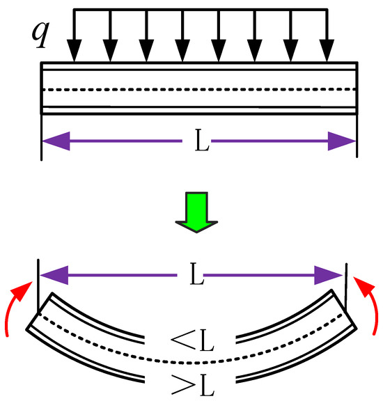 The pipeline was subjected to an external load to produce a bending moment, which manifested as bending of the pipeline itself, thus indirectly reflecting the stress state of the pipeline at different positions. Through the analysis of Figure 7, it can be concluded that the pipeline with length L was bent under uniform loading; the top length was obviously smaller than the original length of the pipeline, and the bottom length was greater than the original length. It can be considered that the top of the pipeline was compressed by pressure, and the bottom was stretched by tension. The strain at the top and bottom of the pipeline was represented in the same diagram to analyze the stress state of the top and bottom of the pipeline. The stress state at the top and bottom of the pipeline was opposite. The top was compressed, and the bottom was pulled, which is consistent with the theoretical analysis of the stress characteristics at the top and bottom of the pipeline, indicating that the test results were reasonable and reliable. Comparing the strain increment at the top and bottom of the pipeline under uniform loading, it was found that the strain increment at the top of the pipeline was obviously larger than that at the bottom, and under the same load, the strain at the top of the pipeline was also significantly larger than that at the bottom, which indicates that under uniform loading, the first deformation and failure position of the pipeline was located at the top of the center of the loaded pipeline.