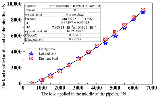 According to the experimental design, the stress scatter diagram at both ends of the pipeline after applying a uniform load is shown in Figure 8. With the increase in the applied load, the force at both ends of the pipeline gradually increased, and the two were positively correlated. Through correlation curve fitting of the force at the end of the pipeline, it was found that the load applied in the middle of the pipeline and the load at the end of the pipeline showed a quadratic correlation, and the fitting degree was 99.7%. The fitting equation is Formula (1):