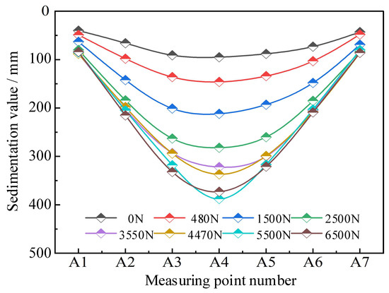 Through statistical analysis of the settlement data of the pipeline after the uniform load was applied, curves of the pipeline settlement with the loading were drawn, as shown in Figure 9. Under the action of a uniform load, the middle part of the pipeline gradually changed shape from the initial flat-bottom shape to the funnel shape with the increase in the load.