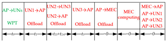 Wireless power transfer (WPT), particularly in the form of a wireless powered communication network (WPCN) [8,9,10], has been recognized as an important method for providing continuous power for mobile communications. The authors of Ref. [11] first applied a wireless energy supply to a cloud computing architecture. UNs first harvested energy and then transmitted data to the cloud. Under energy and delay constraints, an appropriate computing mode (local, or offloading to the cloud server) was selected to maximize the probability of successful computing. Wang et al. [12] proposed a unified MEC-WPT design by considering a wireless powered multiuser MEC system, where an AP integrated with an MEC server was produced to broadcast wireless power to charge UNs, received offloaded data from UNs, and executed computation tasks. This system reduced the transmission energy of UNs for sending data to the cloud. Based on this system, Wang et al. [13] proposed an online learning algorithm for computation offloading using a distributed execution manner in multiple-U, multiple-AP scenarios. Maray et al. [14] proposed a joint DL-based framework that effectively initiates the worthy offloading solution in the orthogonal frequency-division multiple access (OFDMA) WPMEC. Mustafa et al. [15] aimed to generate an effective offloading choice between local and remote computation in a real-time environment. However, these measures still did not resolve the “near–far” effect, which impacted network performance [16,17]. In effect, UNs that are far from the AP harvest less energy but have a longer communication distance than those closer to the AP. Consequently, the “far” UNs require more time than the “near” UNs to transmit their data.