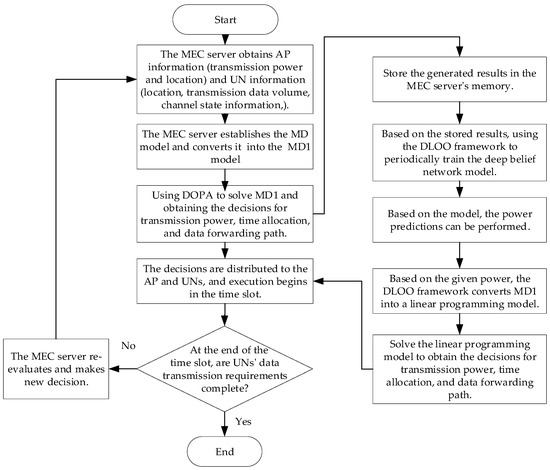 In this system, the MEC server first obtains user and AP information. It then solves the problem using the proposed method to obtain feasible solutions for time allocation, power control, and forwarding paths. Figure 3 summarizes the main steps for solving the problem.