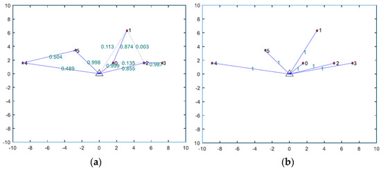 Figure 5 shows the results for the data forwarding paths obtained with and without the cooperation of the UNs. The number on the straight line indicates the proportion of each UN’s data that is forwarded to its relay UNs. For example, the proportions of UN1’s data forwarded to AP, UN0, and UN2 are 0.113, 0.874, and 0.003, respectively. The weight value is calculated based on the DOPA. In the non-cooperative transmission method, each weight is 1, indicating direct transmission to the AP.