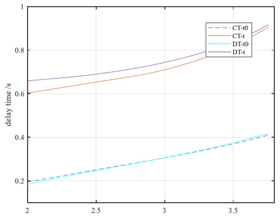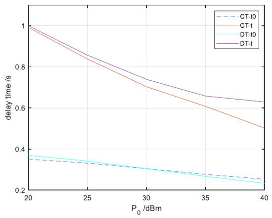 Figure 6 illustrates the delay variation for different AP transmission power values using and N = 6. The results show that the delay of the proposed DOPA is lower compared to that of the non-cooperative method. When is very small, the delay of both the non-cooperative method and the DOPA are similar because UNs harvest less energy, resulting in minimal data being forwarded by the relay UNs. As increases, the UNs can use the energy harvested to forward more information. Consequently, the delay gap between the DOPA and the non-cooperative method gradually increases. As AP transmission power continues to rise, the DOPA allows the UNs to offload more data with enhanced energy channel gains, thereby improving the overall delay performance of the system.