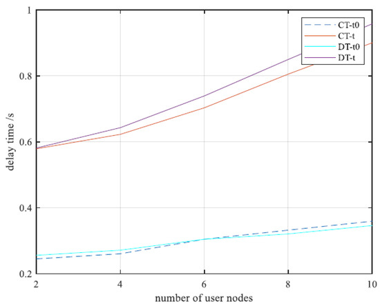 “CT-t0” and “CT-t” are used to denote the harvest energy time and total time obtained using the DOPA. The total time includes both the downlink energy harvesting time and the uplink transmission time. In addition, this section also describes a method for evaluating the delay performance when the UN directly transmits information to the AP. This method is known as the non-cooperative direct transmission method. “DT-t0” and “DT-t” are used to denote the harvest energy time and the total time obtained without UN cooperation.