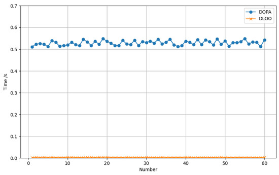 Figure 9 compares the delay of the DLOO with that of the DOPA. With 60 different UN deployments, the DLOO and DOPA calculation times are compared. It can be seen that the calculation time of the DLOO framework was essentially stable at 0.001 s. This delay was within the acceptable range of the UNs, and the calculation time of the DOPA is between 0.5 and 0.6 s. This delay may not be satisfactory for some UNs that are required to handle urgent tasks. The DLOO predicts each UN transmission power value and directly converts the original problem into a linear programming problem. Thus, compared with that of the DOPA, the calculation time is substantially reduced by using the DLOO framework.