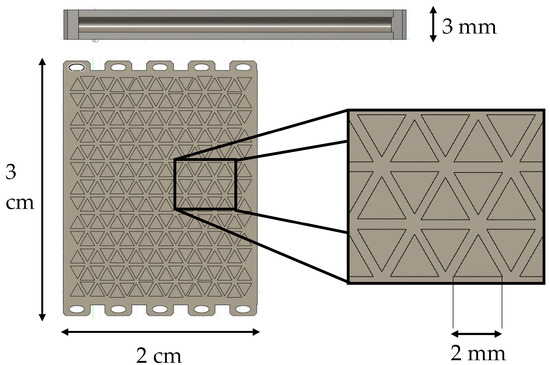 The electrode dimensions were 3 cm long × 2 cm wide × 3 mm thick. We decided to use 2 mm isosceles triangles (Figure 1) as the pattern as a compromise between the optimization of the electroactive surface and the fluid shear response. The electrodes were printed with six different pattern depths in millimeters: no pattern (NP), 0.2, 0.6, 1, 1.4 and through hole (TH). Thus, 6 different depths were used for each material. Prior to ED and characterization, the electrodes were pre-treated with pure acetone for 30 s to ensure their activation [25].