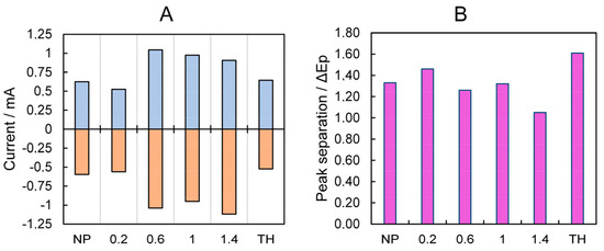 PLA/carbon black electrode results. (A) Anodic and cathodic peak currents and (B) peaks separation.