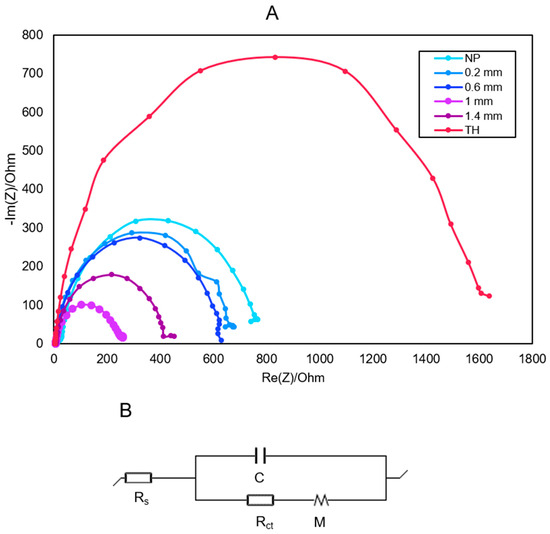 Electrochemical impedance results for the TPU electrode. (A) EIS and (B) electric equivalent circuit.