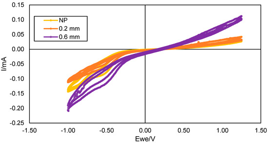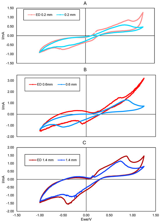 CV comparison between PLA and PLA-ED: (A) 0.2 mm electrode, (B) 0.6 mm electrode and (C) 1.4 mm electrode.
