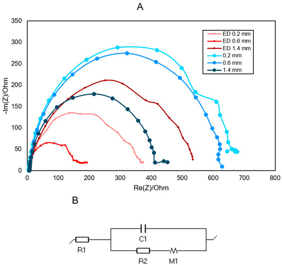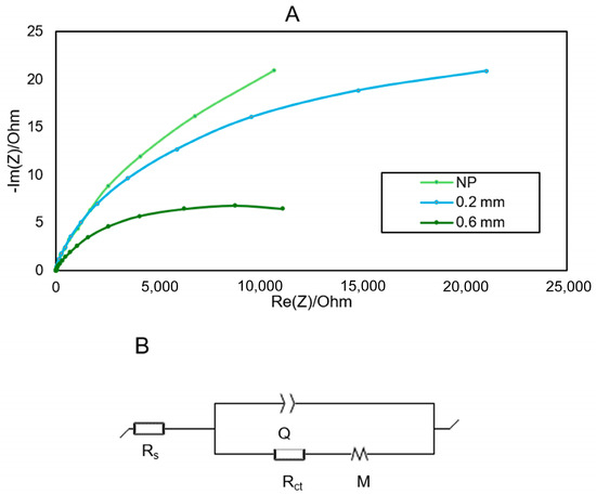 Electrochemical impedance results for the ED-PLA electrode. (A) EIS and (B) electric equivalent circuit.