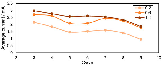 Cyclic voltammetry tests were conducted at the end of the different batch cycles to monitor biofilm development in time (Figure 10). The first thing we notice is that the electroactivity of the biofilm (measured from the maximum currents) kept evolving from cycle 1 to cycle 3, and then it seemed to stabilize across the following cycles to eventually collapse in the last cycle 9, probably because of an accelerated disintegration of the matrix of the electrode. It is also important to note that the width of the CVs tended to increase with time, which is indicative of an increase in electrical capacitance of the electrode as a result of a development of the biofilm [31]. The evolution of the biofilm can be observed through the cyclic voltammetries conducted throughout the operation phase. In all three electrodes, there is a significant increase in current between the initial cycle (i), performed with synthetic medium, and cycle 3 (C3). Similarly, by cycle 5 (C5), after 35 days of operation, the biofilm appears to reach its optimal development. From this point onwards, the cyclic voltammetry results show a decline in both the thickness of the curve, which is related to the biofilm development, and the current peaks at the ends of the curve (oxidation and reduction). Among the electrodes, the 1.4 electrode demonstrates the best performance, although it also shows the greatest decrease between cycle 5 and cycle 7, eventually reaching values similar to the other two electrodes. This suggests that a greater biofilm development leads to a more pronounced degradation of the electrode surface. Despite this, the electrodes maintain a certain level of performance when comparing the curves of cycle 7 (C7) with the initial ones (i). However, in cycle 9 (C9), there is a noticeable decrease in current across all three electrodes, with a slightly lesser decrease in the 0.6 electrode, indicating a virtually null performance likely due to the absence of biofilm.