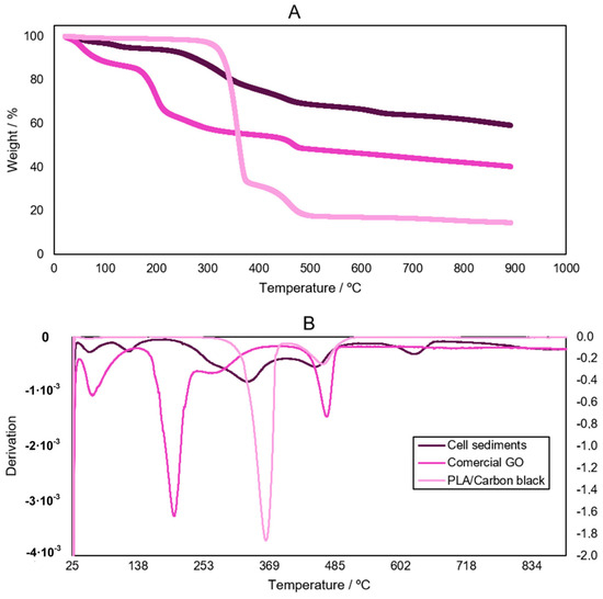 Thermogravimetric analyses for the PLA-ED electrodes after 56 days of biotic operation. (A) Weight loss against temperature and (B) weight loss derivative. Note that in (B), cell sediments and commercial GO are referred to in the left axis, and PLA/carbon black is referred to in the right axis.