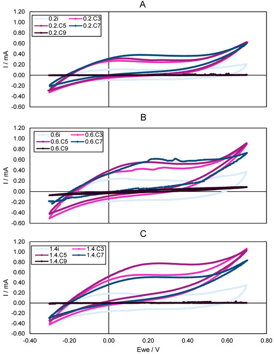 CV comparison for different cycles: (A) 0.2 mm PLA-ED electrode, (B) 0.6 mm PLA-ED electrode and (C) 1.4 mm PLA-ED electrode.