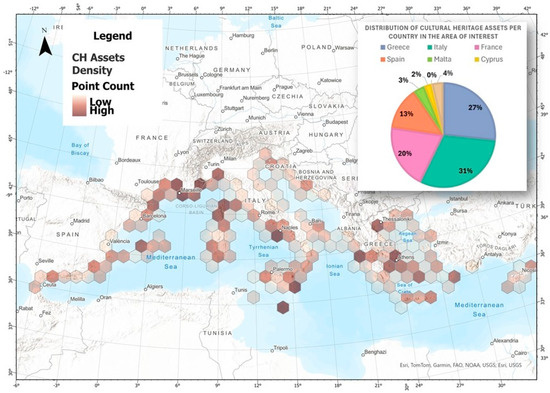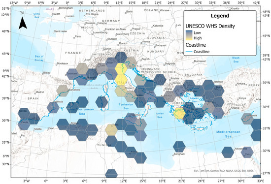 Twenty-eight UNESCO WHSs are located in the area of interest (e.g., Delos in Greece, the old city of Dubrovnik in Croatia, the City of Valetta in Malta, etc.). Furthermore, 3512 heritage point locations were retrieved from OpenStreetMap, presenting a very dense distribution in the coastal areas of Greece, Italy, France, and Spain (Figure 5).