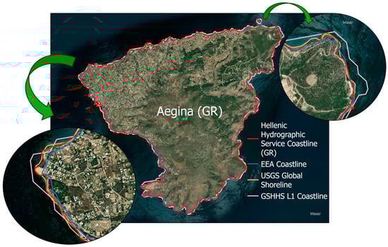 Several global and European-level datasets are available depicting coastline information, including the Global Self-consistent, Hierarchical, High-Resolution Geography Database (GSHHG) [45], the USGS Global Shoreline Vector and the European Environment’s Agency Polygon Coastline Dataset for Analysis. (EEA). GSHHG is a global dataset that combines information on shorelines from two geographical databases, namely the World Vector Shorelines produced by N.O.A.A regarding shoreline data and the CIA World Data Bank II for lake and river boundaries, as well as political boundaries [45]. Its information is organized around four discrete levels: boundaries between land and ocean (L1), lake and land (L2), island-in-lake and lake (L3), and pond-in-island and island (L4) [45]. The USGS Global Shoreline Vector developed by the United States Geological Survey (USGS) is a 30 m spatial resolution dataset developed by using annual composites of Landsat satellite imagery from 2014 [46]. The classification of the imagery was performed in a semi-automated way through the manual selection of the training sites representing water or non-water bodies along the coastline [46]. The result of this process was the classification into two three distinct classes, namely continental mainland polygons (5 entries), islands smaller than 1 km2 (318,868 entries), and islands larger than 1 km2 (21,818 entries). Finally, the European Environment Agency (EEA) provides a polygon coastline dataset for analysis. These data are a composite product that combines satellite information from two distinct projects, namely, EUHYDRO (Pan-European Hydrographic and Drainage Database, link: https://land.copernicus.eu/en/products/eu-hydro, accessed on 6 May 2024) and GSHHG (A Global Self-Consistent, Hierarchical, High-resolution geography database, link: https://www.soest.hawaii.edu/pwessel/gshhg/, accessed on 5 May 2024) [47]. The combined dataset was further modified to comply with the requirements and several policy documents, including the EU Nature Directives, Water Framework Directive, etc. [47].
