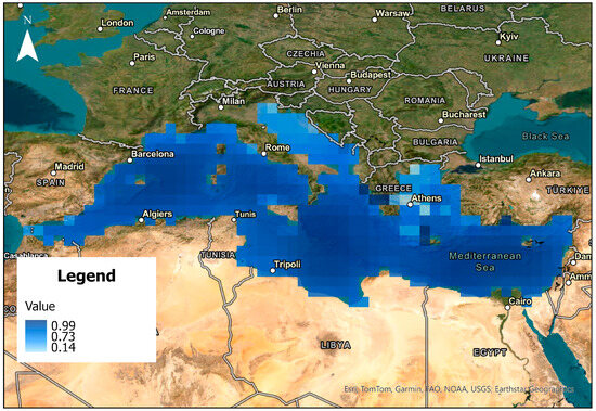Several studies have tried to assess and compare the accuracy between freely available DEMs using either GPS-measured ground control points or finer-scale DEMs produced through photogrammetric processes [63,64,65,66,67,68,69]. The vertical accuracy of the world DEM files depends on the geomorphology of the ground and the terrain of each specific region, but, generally speaking, Copernicus GLO-30 and AW3D30 appear to outperform NASADEM, SRTM, and ASTERGDEM [67,70]. As a result, the Copernicus GLO-30 DEM was selected as the primary source of elevation information in the present research. The dataset’s tiles were converted into a mosaic raster file, projected from WGS84 to ETRS89, and clipped to the area of interest’s extent. The elevation in the area of interest varies from −23 to 1175 m, with the more mountainous locations found in Greece and the Mediterranean complex of islands, while mainland France, Spain, and the Adriatic Sea present lower elevation combined with shallow water locations and major river deltas.