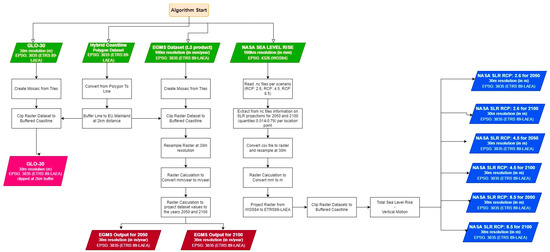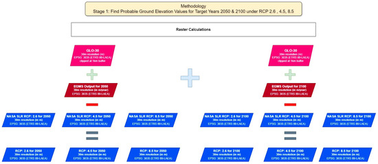 Once the pre-processing stage finishes, the algorithm proceeds to raster calculations to determine the AOI’s elevation for target years 2050 and 2100 under the three RCP scenarios of interest. Through an automated raster calculation process, the algorithm adds GLO-30 DEM values and EGMS vertical land movement values and, finally, subtracts NASA’s SLR Projection Values (Figure 7). This step will provide six new raster layers depicting elevation value under RCP scenarios 2.6, 4.5, and 8.5 for the target years.