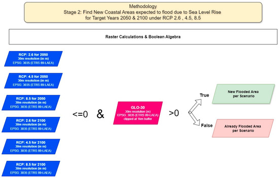 The next algorithmic step involves using raster calculations and Boolean algebra to select and extract the sub-areas in the area of interest that are affected by the different RCP scenarios for target years 2050 and 2100, i.e., the areas that at present have an elevation value greater than zero but in the future—according to the available data and calculations performed at previous algorithmic steps—have a negative or equal to zero elevation value (Figure 8). The output of this stage is six raster files delineating affected areas by the RCP scenarios under consideration for the target years 2050 and 2100. These files can be converted into vector features for further processing, i.e., area calculation, statistics calculation per country, proximity analysis to known heritage sites, etc. The final step involves performing spatial queries to identify the coastal heritage sites expected to be affected by Sea Level Rise under the studied scenarios and organize this information per type of monument (i.e., UNESCO World Heritage Site or Cultural Heritage Site) and per country to assess the level of vulnerability that each Mediterranean EU-27 country’s heritage faces.
