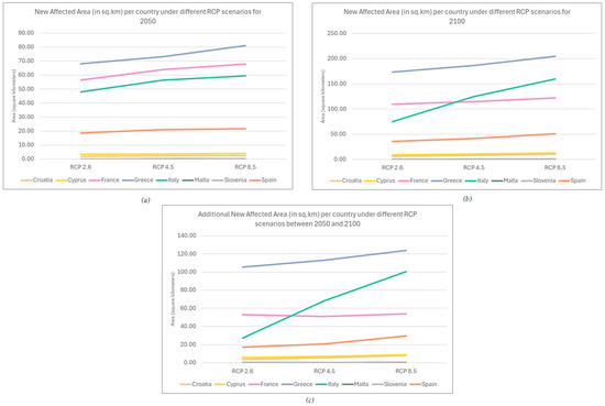 Table 2 presents the calculated area, in square kilometers, expected to be affected by SLR per country. As can be seen in Figure 9, the coastal areas of Greece, France, and Italy are expected to be more affected by Sea Level Rise scenarios. At the same time, Malta, Slovenia, and Croatia do not seem to face significant threats and the effect of the different RCP scenarios remains rather constant per target year. That can be attributed to the extensive coastline of Greece and Italy but also to the geomorphology and elevation of certain parts of France, since France ranks 5th in terms of coastline length but surpasses Spain and Croatia in the extent of the SLR-affected area (Table 2). Finally, it can be noted in Figure 9c that the effect of SLR is expected to be more prominent in Greece and Italy between 2050 and 2100 under the different RCP scenarios, while France, Cyprus, Croatia, Slovenia, and Malta will present a rather constant number of additional coastal flooded land under the three scenarios.