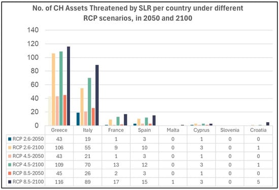 The effect of different RCP scenarios does not appear significant at least for the 2050 projections. The number of CH assets under probable inundation risk, however, doubles and sometimes triples between 2050 and 2100, with Italy, France, and Spain also presenting high sensitivity under the different RCP scenarios (Figure 11). On the contrary, the coastal heritage assets of Croatia, Malta, Slovenia, and Cyprus seem to be more protected from SLR.