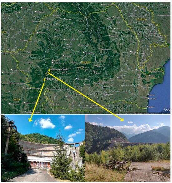 The Gura Apelor dam represents the tallest embankment (rockfill with a clay core) dam in Romania and the second largest dam of this type in Europe, after the Thissavros Dam in Greece [19]. It is located in the Hunedoara county (Figure 1) on the south-western edge of the Retezat National Park, approximately 40 km away south from the Hațeg town in the same county. The dam (Figure 1—right) is accessible to the public both by car and foot, with the crest of the dam part of the local road DJ685, popular with both locals and tourists hiking the local mountains. Located at the confluence of the Lăpușnicu and Șes River, tributaries to the Râul Mare river, the dam was commissioned in 1986.
