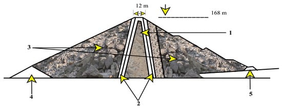 The vertical section of the dam. 1—clay core, 2—inverted filters, 3—rock, 4 and 5—filling prisms. The height of the dam is 168 m and the width of the crest is 12 m. Image reproduced after Popovici, 2022 [23].