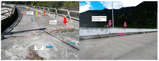 When it comes to the crest of the dam, there are several aspects which can represent minor damages to the dam, as it is the case of the numerous cracks visible from the surface and even patches with grown vegetation (Figure 3—left). From just visual inspections and routine surveys of displacements and deformations, it is difficult to determine whether these cracks are merely superficial damage to the top layer of the concrete or if they extend deeper into the structure. However, both cracks [29] and the presence of vegetation tend to retain moisture in their vicinity. Even if their origin is superficial, this moisture retention can lead to a gradual long-term deterioration of the crest’s surface.