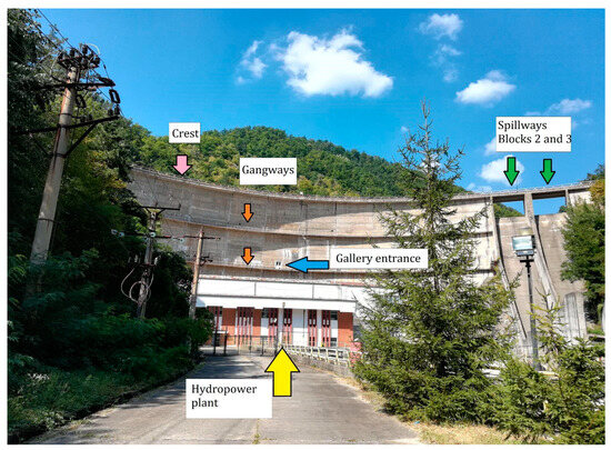 The elements of the Herculane dam visible from the downstream side: dam’s crest, the hydropower plant, the entrance to the gallery, gangways, and spillways.