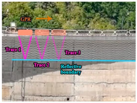 GPR is also well suited to the flat continuous surface of dams. As long as good contact between the antenna and the surface on which the surveys are carried out is ensured, the antenna frequency is suitable, and there are no major interferences or sources of noise or attenuation, the GPR method can be used on both concrete and rockfill dams [12,34,35].