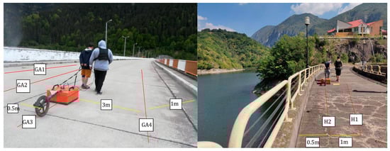 Therefore, considering all of the above, four profiles (GA1–GA4) were carried out longitudinally on the whole length of the dam’s crest from one end of the dam to the other (Figure 6—left). The profiles were positioned symmetrically from the center of the dam, starting from the access road side towards the spillway gallery. In terms of distance between the profiles, two profiles are located in the middle with a distance between them of 1 m, positioned on each side of the middle line of the dam’s crest (Figure 6), and two other profiles are positioned closer to the edges of the crest (1 m away from the kerb and 3 m away from the closest middle profile).