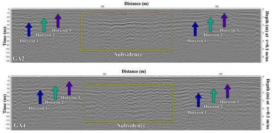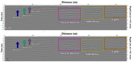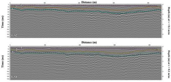 Across all of the profiles, a consistent feature is the presence of three distinct almost uninterrupted horizons (Figure 7 and Figure 8) which span from one side of the dam to the other. In Figure 7, two profiles are shown: profile GA2 (Figure 7—up), which is closer to the middle of the dam, and profile number GA4 (Figure 7—down), which is closer to the edge of the dam facing the reservoir, 4 m apart in between.