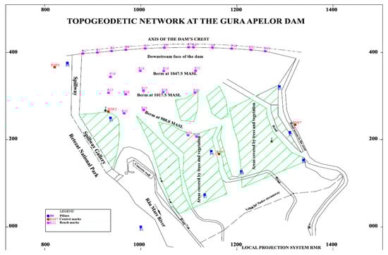 With a maximum height of 168 m and a total length of 464 m, the dam’s width at the base is 556 m and at the crest is 12 m with a total volume of 10,285,000 m3 [20]. The foundation rock of the dam (Figure 2) is represented by metamorphic rocks [21], with quartzite schists on the right side and sericeous phyllitic shalles on the left side [22]. The rock material from which the dam was built with is also local and is represented by hard granite schists [20] with a total rock fill volume of 6,422,000 m3. The core (Figure 2) comprises clays with superior plastic qualities, with 50–80% of rock fraction, with a total volume of 1,127,000 m3. This type of clay has a reduced permeability, and it appears to have a self repair property due to these characteristics in case of any fissures [22] and is surrounded by layers of inverted filters with a volume of 183,000 m3. Due to mechanical and morphological asymmetries of the rocks and the valley in which the dam was built, at the base of the dam supporting prisms have been built for the stability of the dam [23], with a volume of 883,000 m3. Other features which are not represented in Figure 2 are the draining gallery, which is found at the basis of the filters on the side facing the downstream, a gallery at the base of the core, with the role of visiting, injecting, and draining, and the spillway and the bottom outlet, which have been placed on right side of the dam. There are actually two spillways built; apart from the bottom outlet at an altitude of 1025 m.a.s.l., the other one is higher at an altitude of 951 m.a.s.l. [24].
