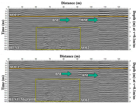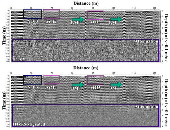 Even though these layers appear to be relatively constant in appearance from one side to the other, there are some areas with gaps more visible in Figure 9. These are called gaps just because the reflections are not as intense as the general pattern of the horizon from which they appear to belong. This character might be due to an increase in moisture content, which reduces the speed of the waves traveling through the medium, therefore reducing the intensity of what appears to be a linear anomaly, with higher intensities throughout the profile [43].