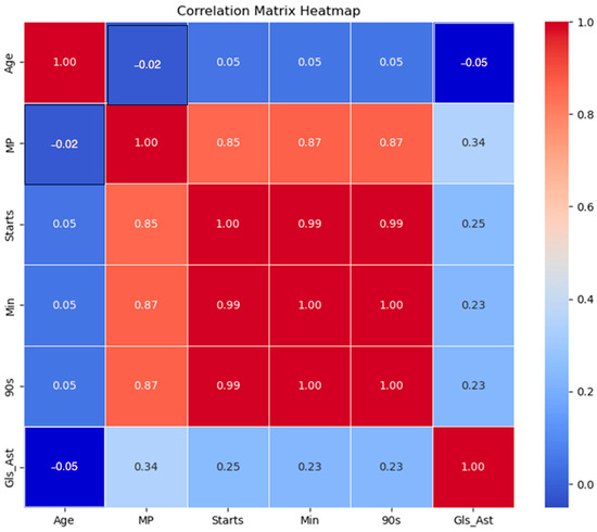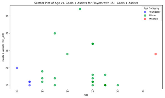In the field of football performance analysis, age is frequently seen as a relevant factor that may influence player performance, as shown in Figure 12. This research thoroughly examined player attributes and their relationship to performance indicators. Initial findings from correlation analysis and feature importance scores obtained by ML models revealed that age had a relatively minor impact on player performance, with correlation scores of −0.05 indicating a weak negative correlation, and feature importance scores ranging from −0.05 to 0.032, indicating that it is a weak predictor when it comes to predicting performance.