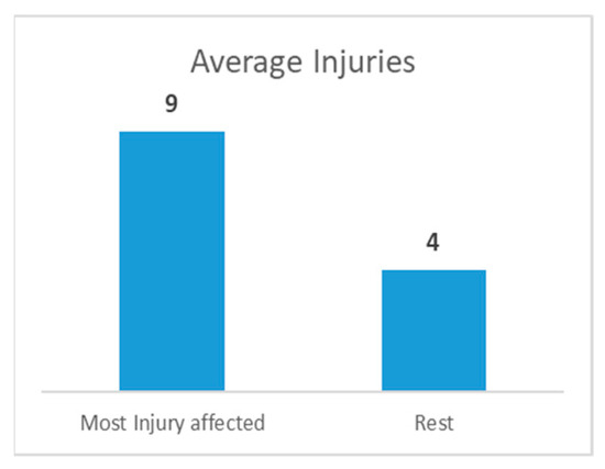 Figure 14 clearly distinguishes between the squad classifications and their average injuries. The ‘Most Injury Affected’ category, which includes the top five clubs with the most injuries, stands out with an average of nine injuries per team. In other words, on average, these heavily afflicted teams face a significant injury load, approaching double digits. In sharp contrast, the ‘Rest’ group, which includes the remaining teams not in the top five, reports an average of only four injuries per squad. This considerable gap highlights the importance of squad categorization in injury occurrences. It supports the study’s conclusion that squad composition is vital in forecasting and managing injuries in football teams.