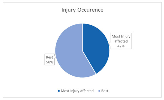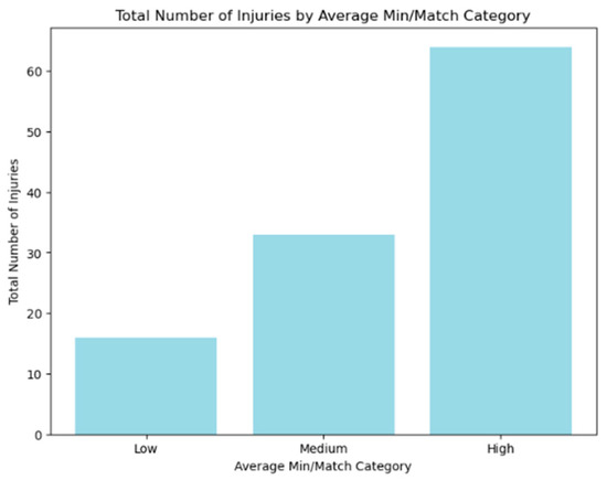 According to Figure 16, a substantial proportion of injuries, roughly 57%, occur in the ‘High’ group, showing that players who routinely play more than 75 min per match are more likely to get injured. In contrast, the ‘Medium’ category, which includes players who average 60 to 75 min every match, accounts for approximately 30% of all injuries. Only 16 injuries occur in the ‘Low’ category, which includes players who play fewer than 60 min per match. This concept emphasizes the need for calculated player substitutions during games. Coaches and team managers should think carefully about when and how to replace players who have been on the field for extended periods of time. Timely substitutions allow players to rest and recover, lowering the chance of injury due to exhaustion or overexertion.