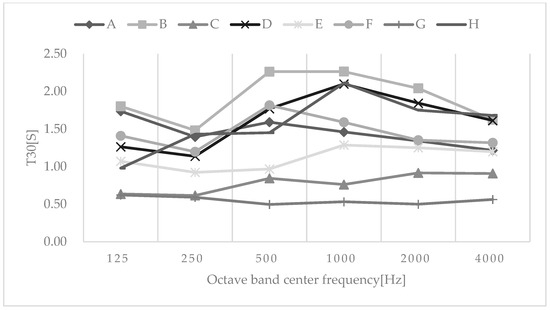 In the study by Busch-Vishniac et al. [11], the authors’ analysis focuses on the reverberation time (T30) in each lobby. The results of the measurements showed that the T30 at 0.5 kHz and 1.0 kHz ranged from 0.5 s to 2.26 s, as shown in Figure 4. Correlation analysis was performed on the results of each frequency band of T30 and noisiness to determine their correlation [30]. The results are shown in Table 4.