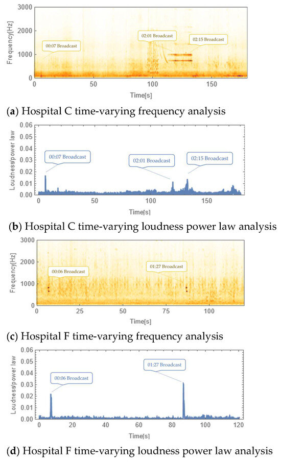 Lastly, we needed to ascertain the specific noise events in the mid- and high-frequency bands that affect the hall. We therefore conducted time-varying loudness power law and frequency analysis on the audio samples from Hospital C in team α and Hospital F in team β and then manually listened to the audio samples to determine the specific noise events. The results are shown in Figure 7.