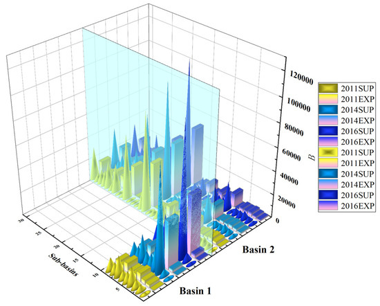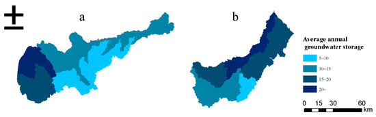 - The average groundwater recharge in the Jiamusi area between 2008 and 2016 was estimated by the remote sensing water balance method to be 53.2 × 108 m3, while the average exploitable amount was found to be 23.94 × 108 m3. The recoverable amount was 27.4 × 108 m3, and the average groundwater recharge was 61.03 × 108 m3, according to the SWAT model. Between 2010 and 2016, the No. 1 basin’s average groundwater runoff modulus was 0.89 L/(s·km2), total recharge was 31.522 billion m3, and total recoverable amount was 14.184 billion m3. In the No. 2 basin, the total recharge was 11.256 billion m3, the total recoverable amount was 5.065 billion m3, and the average groundwater runoff modulus was 1.113 L/(s·km2).