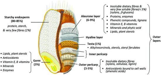If we compare the composition of the bran with the other parts of the grain, we obtain the following: the starchy endosperm (besides available carbohydrates) consists of 15% lipids, 13% proteins, dietary fiber (0–5%), and ash (1–5%) [25], and wheat germ is rich in proteins (25%), lipids (8–13%), and ash (4–5%).