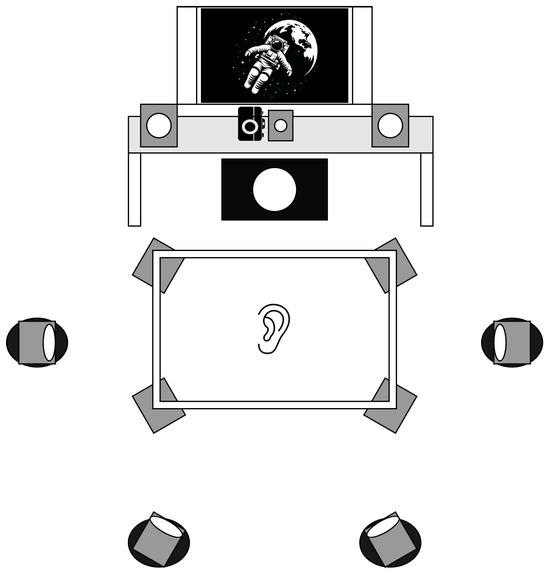The room in which the system was set up is an acoustically treated studio control room. The background noise level was measured at 30.6 LAEq (15 min) using an NTI Audio XL2 analyser [56]. Participants were seated in the system’s acoustically optimal area, commonly known as the sweet spot, with the 42-inch television screen being placed 1.61 m away. This distance was chosen based on guidance from the International Telecommunication Union (ITU) for pairing moving images with multichannel audio [57].