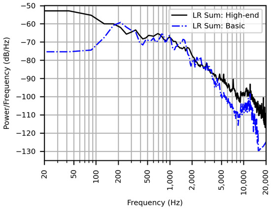 Measurements of the stimuli loudness were performed in both conditions, initially objectively using a Tenma 72-860A [58] loudness meter (purchased in the UK) and then subjectively using two expert listeners. Using the objective approach, loudness was initially set to peak at 85 dB SPL (A-weighted). Subsequently, an expert listener was tasked with switching between the two conditions and adjusting them so they were both at a comfortable listening level and also had no perceivable difference in loudness. After the loudness had been matched perceptually, a binaural recording was made using a Neumann KU 100 [59] dummy head microphone (purchased in the UK) to allow for an objective comparison of the frequency content. The frequency analyses of these two recordings can be seen in Figure 2.