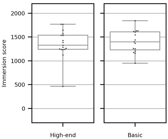 Box–Swarm plot showing the distribution of immersion scores for each group. The limits of the plot represent the highest and lowest possible scores associated with the immersion questionnaire, −300 and 2200.