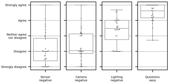 Figure 4 shows the participant’s responses to the question, regarding how the camera, lighting, and ECG sensor, influenced their audiovisual experience. These results show that these factors had a variable impact on the participant’s viewing experience. To assess if there was a significant difference in the average response value for the questions associated with the negative impact of the ECG sensor, camera, and lighting, pairwise comparisons were made. As the Shapiro–Wilk test assessed that the responses were not all normally distributed, the Mann–Whitney U test was applied. These tests revealed no significant difference in median response between the questions associated with the negative impact of the ECG sensor and camera (U(31) = 384.5, p = 0.178). However, when comparing these distributions with the responses to the question associated with the negative impact of the room illumination, in both cases, a significant difference was found (camera: U(31) = 169.5, p < 0.001; ECG: U(31) = 204.0, p < 0.001).
