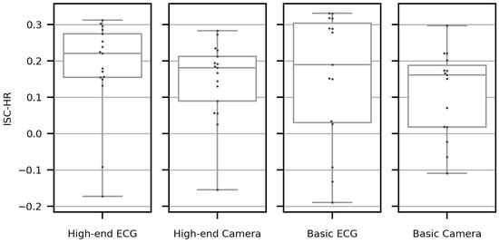The use of HR data captured using a camera method for ISC-HR analyses has not been previously explored. However, there is a larger body of research that has shown the feasibility of using a camera to evaluate stress in a variety of application conditions, solely based on cardiological signals extracted from facial videos [44,45,46]. In the context of ISC-HR measurement, downsampling and low-pass filtering are common parts of the HR extraction process [9,10,11,12,13]. A similar moving average HR signal can be sourced from a camera [47]. For information regarding the method used to obtain HR data using a camera, see Section 3.3.