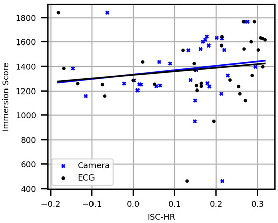 To measure immersion in this study, we apply a novel camera-sourced physiological feature alongside an established self-report method. The camera-sourced feature captures the extent to which a participant’s heart rate (HR) rises and falls synchronously with the rest of the cohort in response to the evolving narrative. This feature, known as HR inter-subject correlation (ISC-HR), has been shown to index immersion [9,10], attentional engagement [11,12], and flow [13] when acquired using an electroencephalogram (ECG). However, no research has been conducted that attempts to obtain this feature using a camera. To properly evaluate the camera-sourced feature, an ECG is also used in this study. We propose that the camera may be deployed without an ECG in future research. The camera-based method is considered advantageous as it avoids the discomfort and obtrusiveness of physical sensors. Moreover, this method is promising due to its potential for simultaneously capturing other experientially indicative features, such as facial movements and gaze direction.