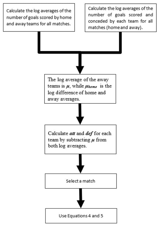 Equations (4) and (5), which are used to calculate the expected number of goals for the home and away team, are Poisson regression models and are considered generalized linear models (GLMs), and thus, we have achieved the modeling of the expected goals for a team using its playing performance. Figure 1 illustrates the steps of our proposed algorithm.