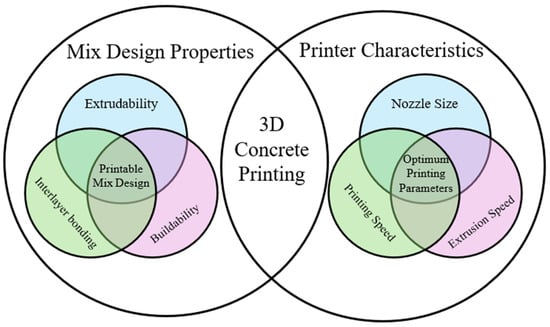 This phenomenon, often referred to as cold joint formation, has a greater influence over the anisotropy of printed elements [38] and arises from the limited interaction between subsequently deposited layers [39]. So, the layers are required to be flowable, which facilitates smooth extrusion and stronger interlayer bonding; however, this negatively affects buildability [30]. This crucial balance, keeping in view the time-dependent rheological properties of concrete, is the most difficult component of 3DCP, which is further aggravated by the variable mechanics of the printer design [16]. Most of the printable mix designs used in commercial-scale printing are protected as intellectual properties, while those available to researchers rely on an iterative approach for their formulation [40,41,42,43,44]. This way of developing the mixed design of printable concrete is costly and generates a huge amount of waste, negating its inherent benefits and eventually restricting the widespread implementation of this technology in the construction sector [5,45,46,47,48]. A generalized interaction of concrete printing devices and rheological properties of concrete for 3DCP is shown in Figure 2.